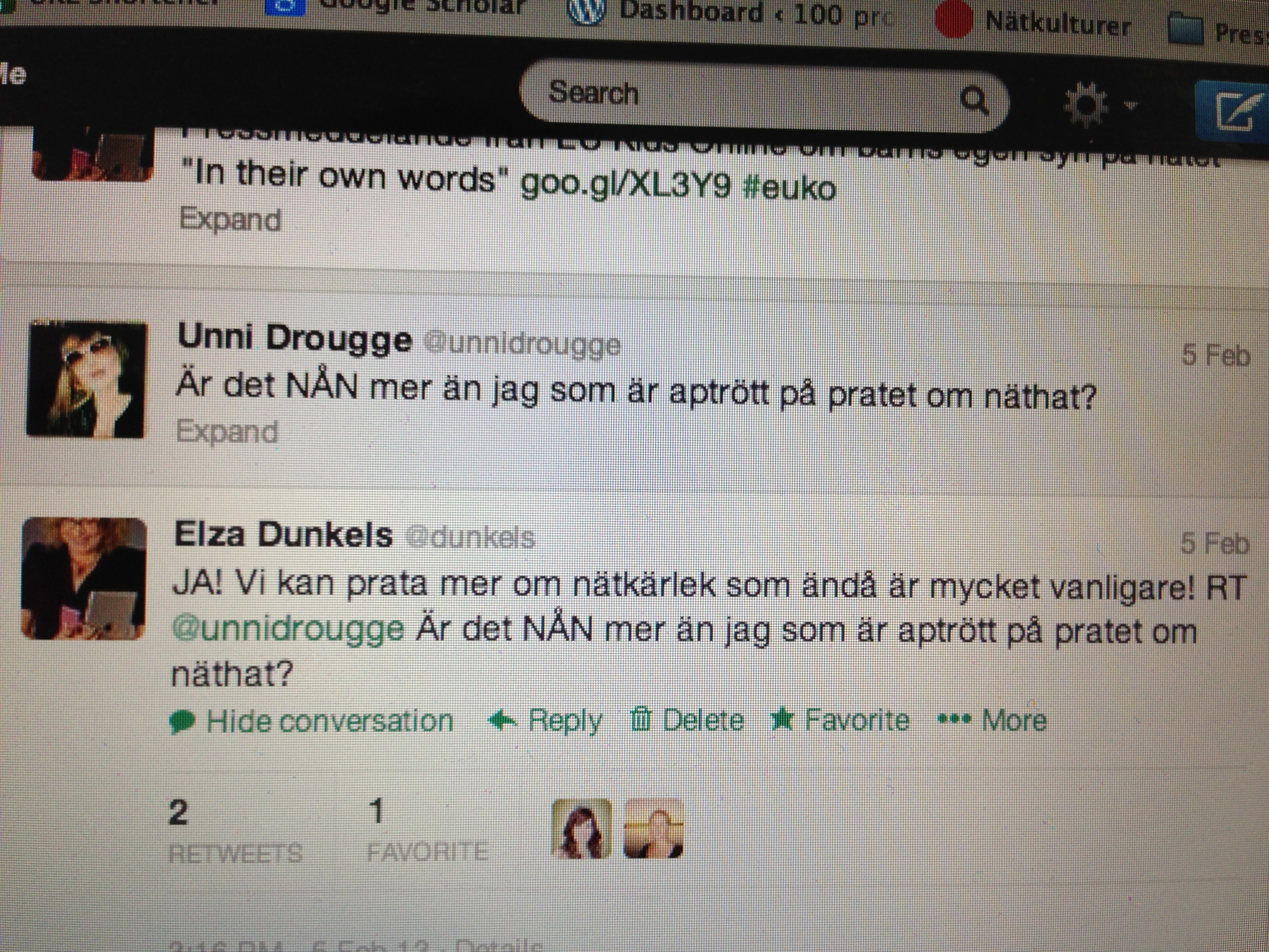 Jag var på resande fot båda de dagar som näthat och nätkärlek tog över livet. De stunder jag inte var i möten eller uppe i luften satt jag i telefonintervjuer känns det som. För min del började allt med ett inlägg av Unni Drougge på twitter. Sen var min fantasi igång och jag skrev ett blogginlägg.