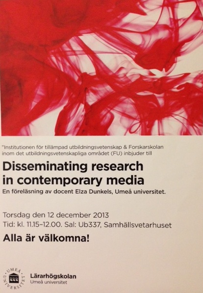 Om du befinner dig i Umeå torsdag den 12 december kan du höra mig prata en stund på ämnet Disseminating research in contemporary media. Jag kommer att hålla en kort föreläsning på engelska om hur jag kommunicerar med media och hur jag använder sociala medier för att utföra universitetens tredje uppgift. Arrangemanget är en del av terminsavslutningen för doktorander men min föreläsning vänder sig till allmänheten, studenter och anställda på universitetet. Så du är extremt välkommen! Ingen förhandsanmälan krävs. Du kan komma även om du inte har engelska som modersmål för det har inte jag heller nämligen.