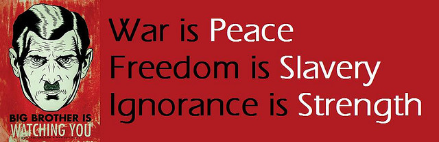 Anledningen till att partiet lanserar nyspråk är att hindra felaktiga tankar. Nyspråk bygger alltså på idén att den som saknar begrepp för ett fenomen inte kan tala om eller tänka om det (jag skriver lite om det i min bok men då kopplat till frigörelse på nätet, inte till nyspråk som sådant). Och detta blir så skrämmande relevant när så många idag försöker definiera om ord som yttrandefrihet, censur och demokrati. När yttrandefrihet definieras om till att betyda att vem som helst får säga vad som helst till vem som helst när som helst och var som helst, se t ex Almedalen och Bokmässan. När censur definieras om till att omfatta en bokhandel som inte vill saluföra nazistisk smörja och när demokrati plötsligt betyder att tyckande är lika mycket värt som kunskap och att odemokratiska krafter får förhindra ett demokratiskt samtal, se t ex Almedalen och Bokmässan.
