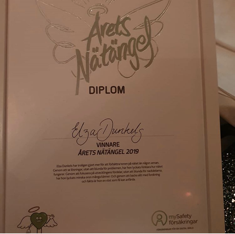 I måndags gick jag på gala i Stockholm. Jag var nominerad till Årets nätängel, det pris som MySafety har delat ut sedan 2015. Så jag och min dotter åkte ner och gick på den otroligt fina festen, med bubbel, trerätters middag, underhållning och prisutdelningar i flera kategorier. Till sist var det dags för huvudpriset, Årets nätängel, och då började jag på allvar tänka att ”det kan ju faktiskt vara jag”, följt av en kort repetition av det tacktal min bordsgranne hade coachat mig i. Jag såg framför mig att jag skulle tänka på att inte snubbla, att jag skulle hålla talet kort för att inte tråka ut folk men att det samtidigt var viktigt att få sagt ungefär: