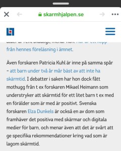 Punkt 1 är väldigt viktig, för den betyder att vi aldrig kommer att få forskningsresultat som visar att skärmtid är dåligt. Vi kommer heller aldrig att kunna belägga att det är bra. Vi kan säga som med många saker i livet; det finns skärmtid som får vissa att må bra och det finns skärmtid som får vissa att må dåligt. I bakgrunden finns dock alltid ett barns livsvillkor. Om barnet har vettiga vuxna omkring sig, vuxna som bryr sig och lyssnar, vuxna som förstår att barnet måste få göra misstag och att de måste våga berätta om det, då har barnet mycket goda chanser i livet. Om barnet däremot har strikta och ointresserade vuxna omkring sig, vuxna som skammar och straffar barnet (nej förlåt de skulle inte säga straff, de kallar det ”konsekvenser”), då är risken större att barnet råkar illa ut och inte tror att det finns någon som förstår dem.