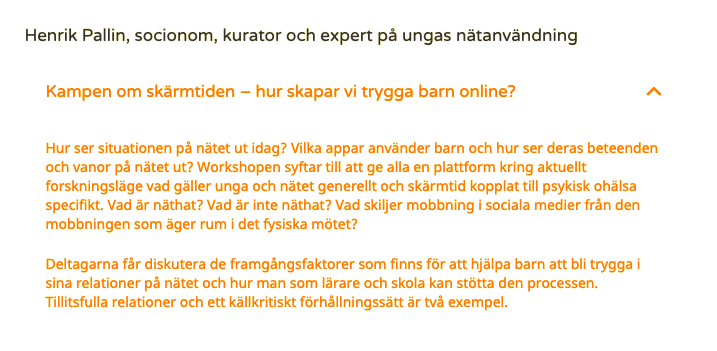 Det är så många intressanta punkter; föreläsningar, samtal och workshops. Bl a ska Henrik Pallin och jag sitta i ett samtal om unga och nätet tillsammans med Felix Gyllenstig Serrao. Och jag ska hålla en föreläsning. Utöver det ska jag försöka hinna med så många som möjligt av alla de andra föreläsningarna, t ex: